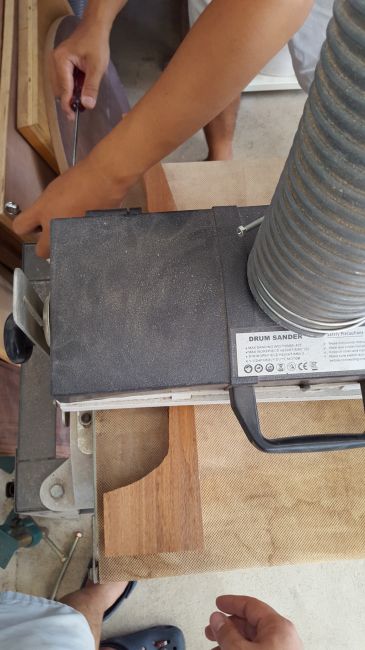 หลังจากตัดไม้ส่วนคอเสร็จแล้ว ให้ทำการรีดไม้ โดยใช้ Drum Sander หรือเครื่องขัดกระดาษทราย เพื่อปรับให้ทุกส่วนเรียบ เพื่อที่ตอนประกบคอกีต้าร์ 2 ส่วนจะต้องแนบชิดสนิทกันไม่มีช่องว่าง เพราะต้องทากาวติดกัน